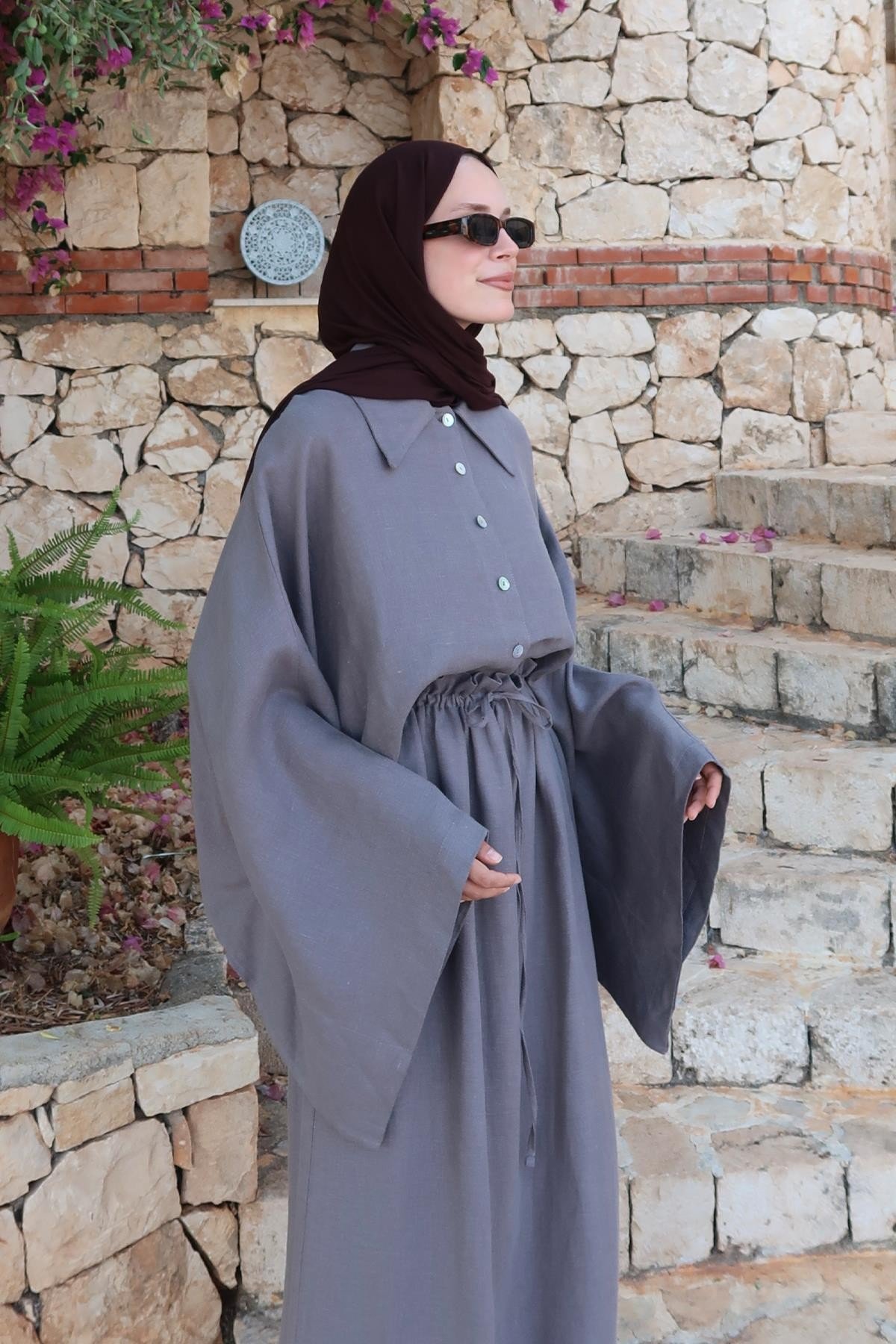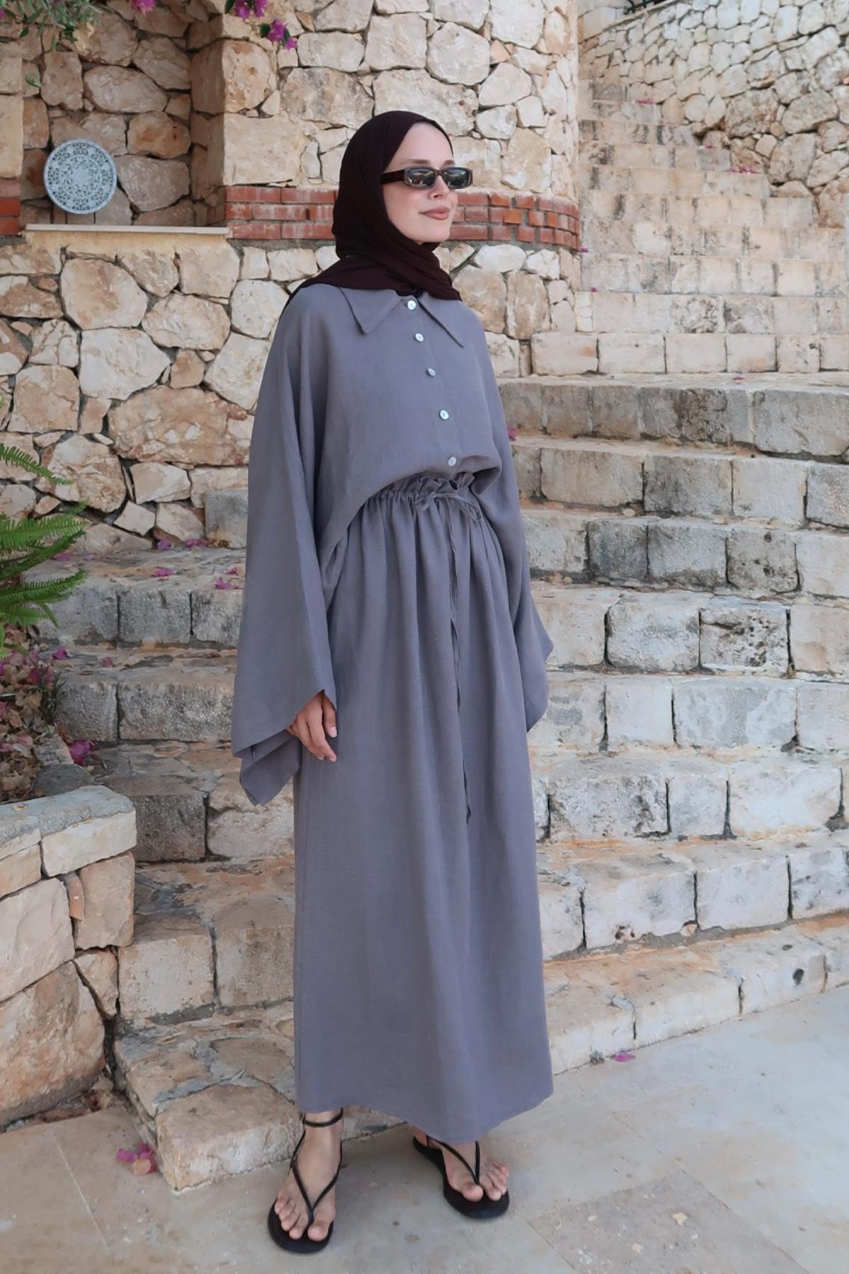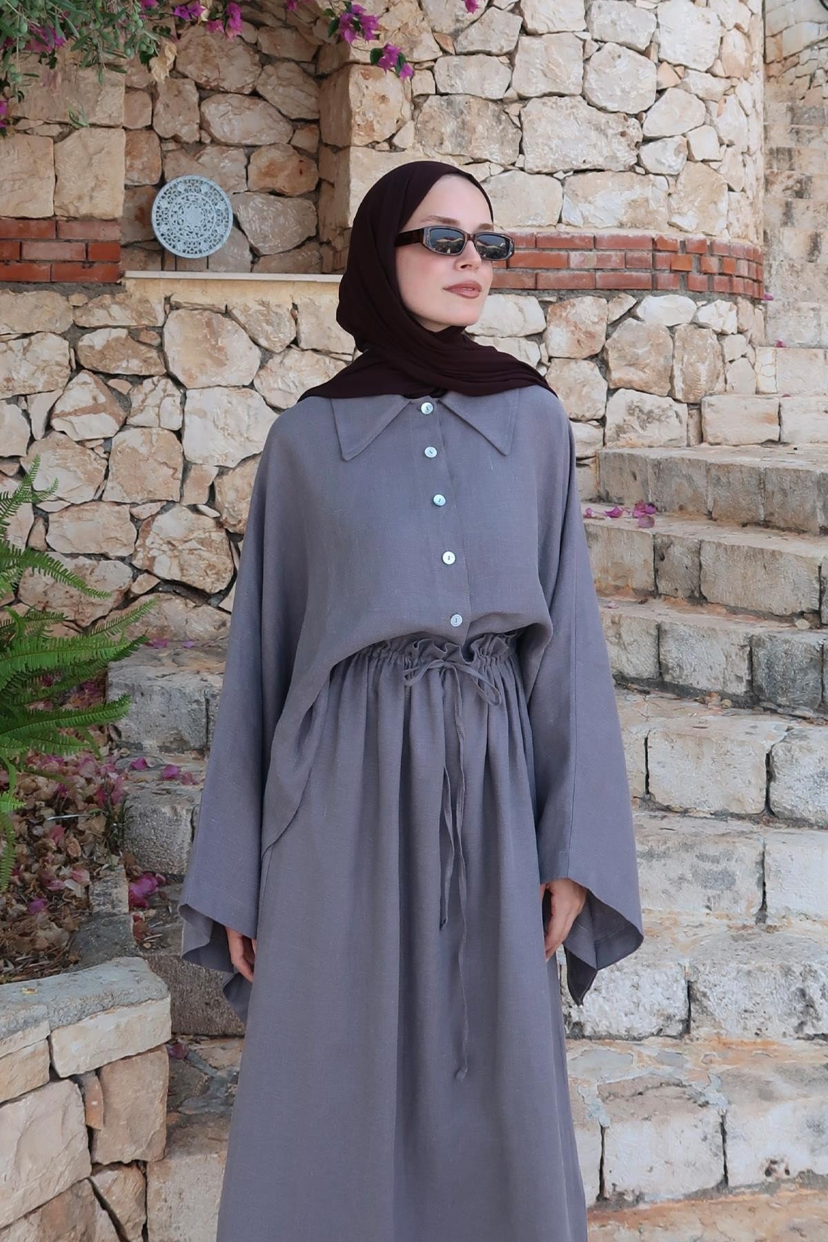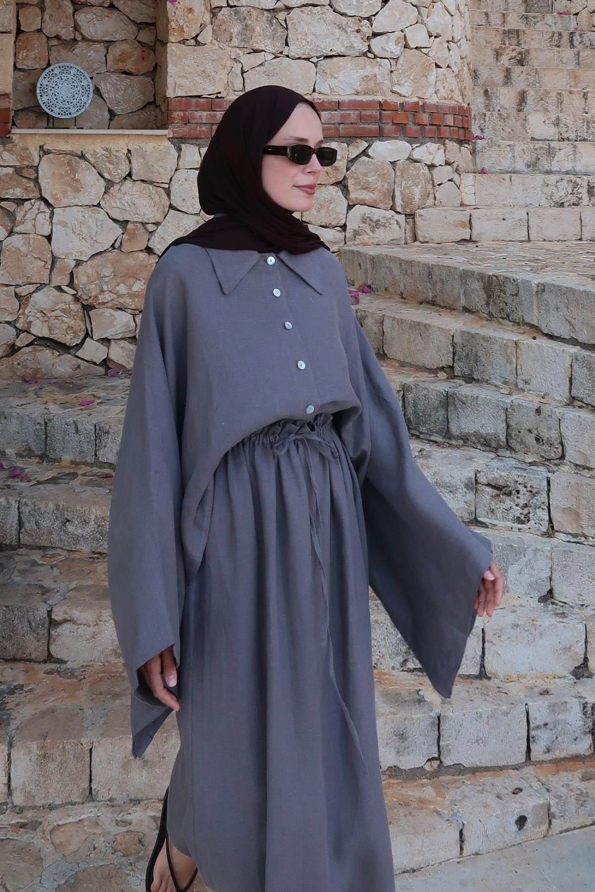 Yumuşak ve nefes alan %100 keten kumaşıyla yaz-kış konfor sunarken, önden tam düğmeli yapısı ve keskin yaka detayıyla klasik gömlek formunu modern bir siluetle buluşturur. Önü kısa, arkası uzun asimetrik kesimi ve dökümlü yapısıyla hem şehir şıklığına hem doğal bir stile uyum sağlar.