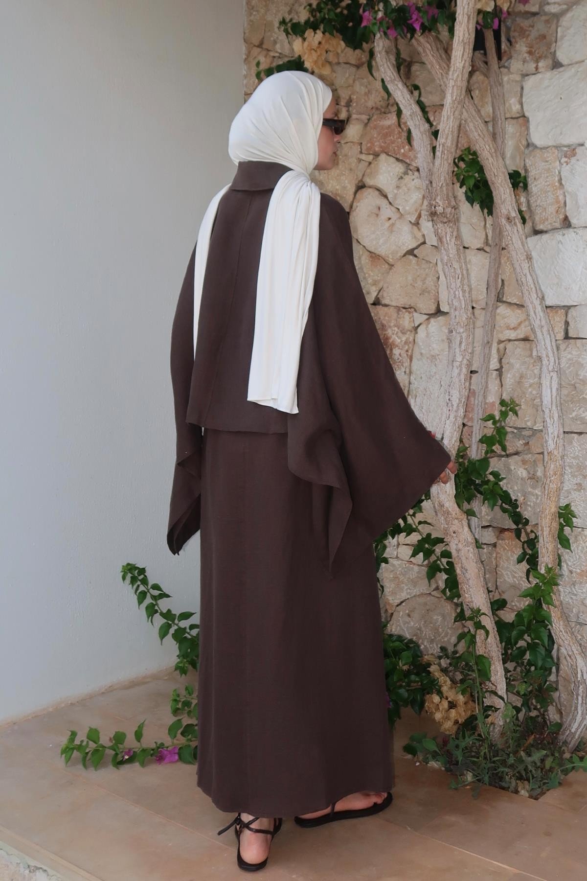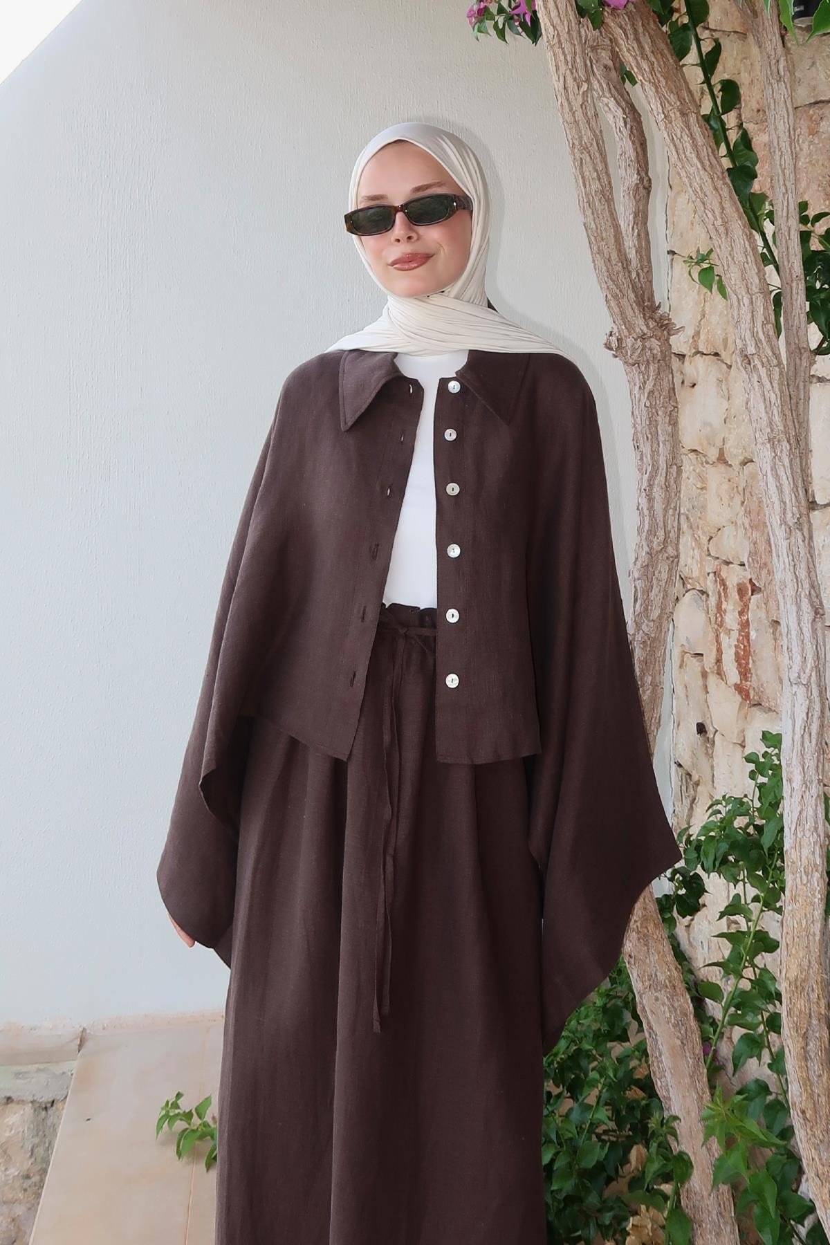 Gardırobunuzun vazgeçilmez parçalarından biri olacak Ruwa Gömlek, ketenin sade zarafetini farklı bir yorumla sunuyor.Bu gömleği, Nahla Maxi Etek ile kombinleyerek zarif bir uyum yakalayabilirsiniz.