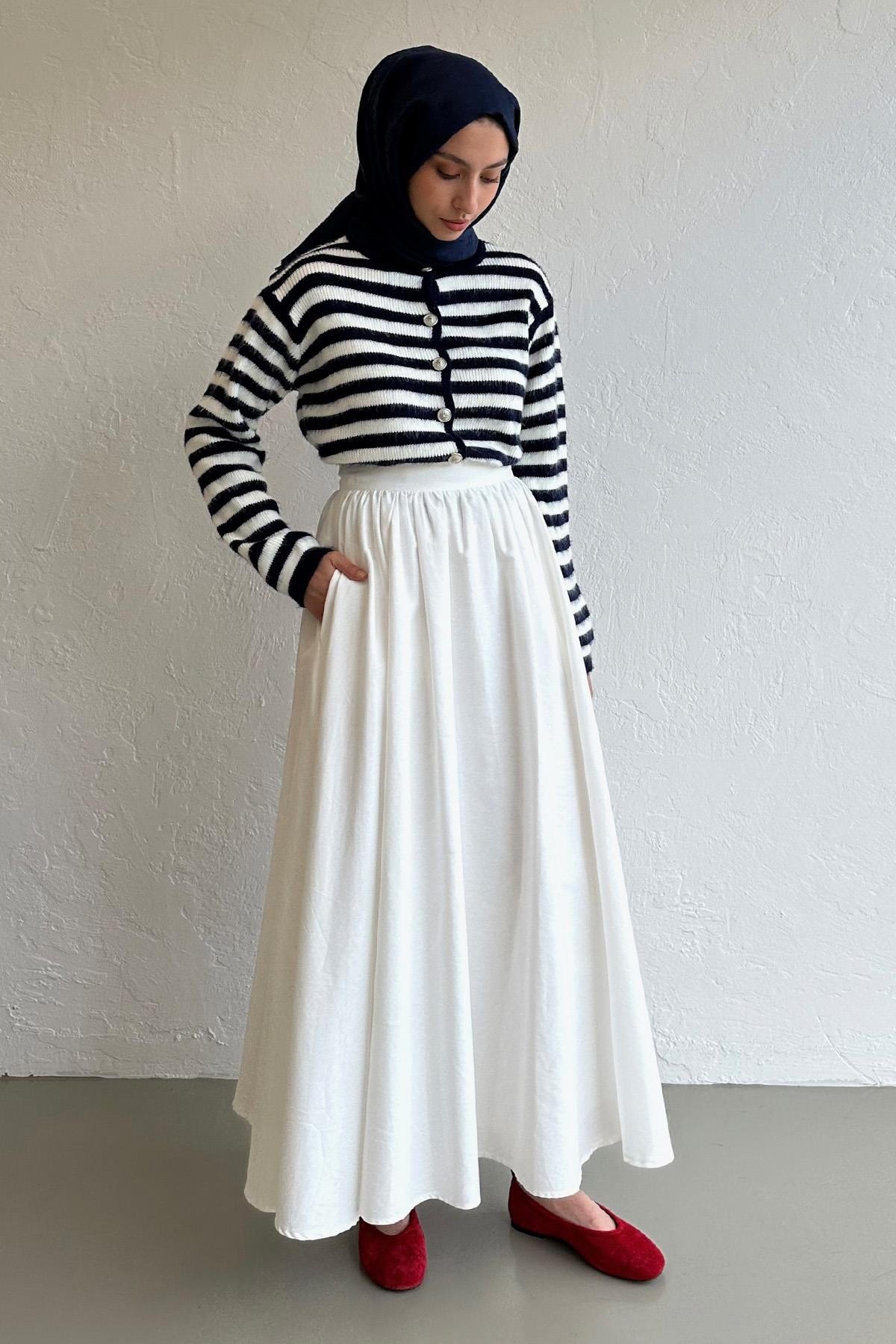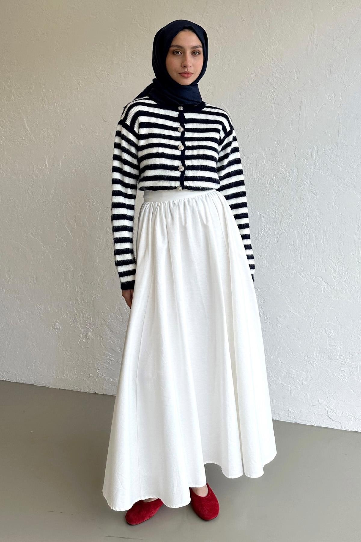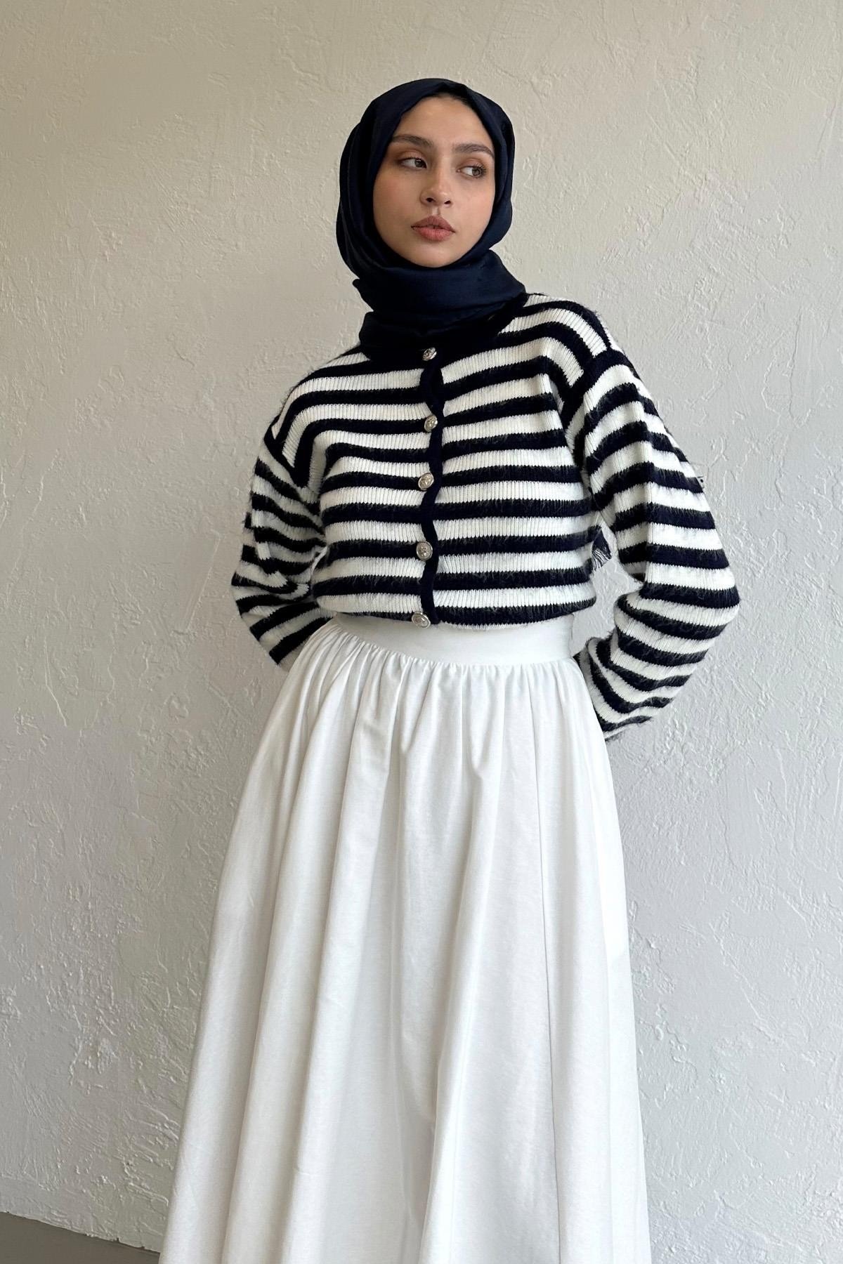 Silver Düğmeli Çizgili Lacivert Triko Hırka, Soğuk esintiler mevsiminin trend parçalarından triko hırkalar ile tarzını yansıt. Görünümünü  Beyaz Crush Etek ile tamamla.