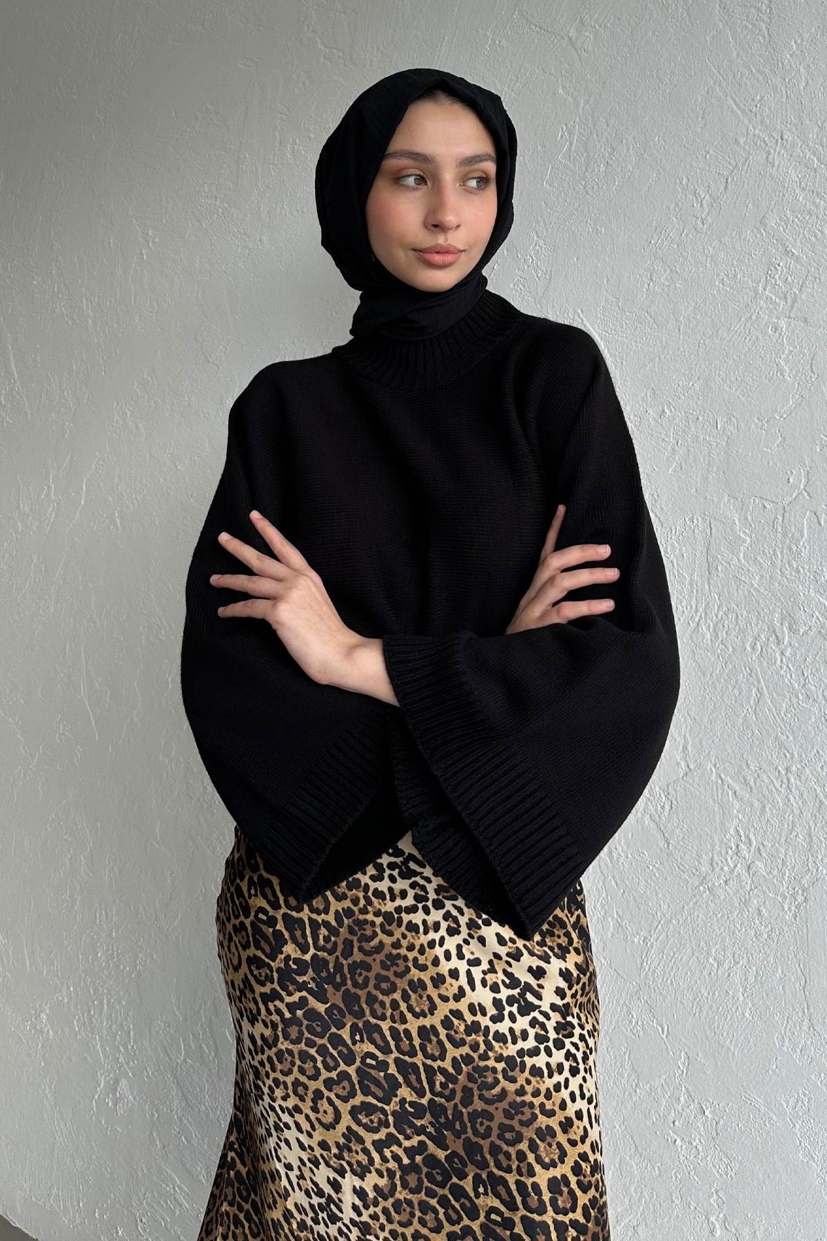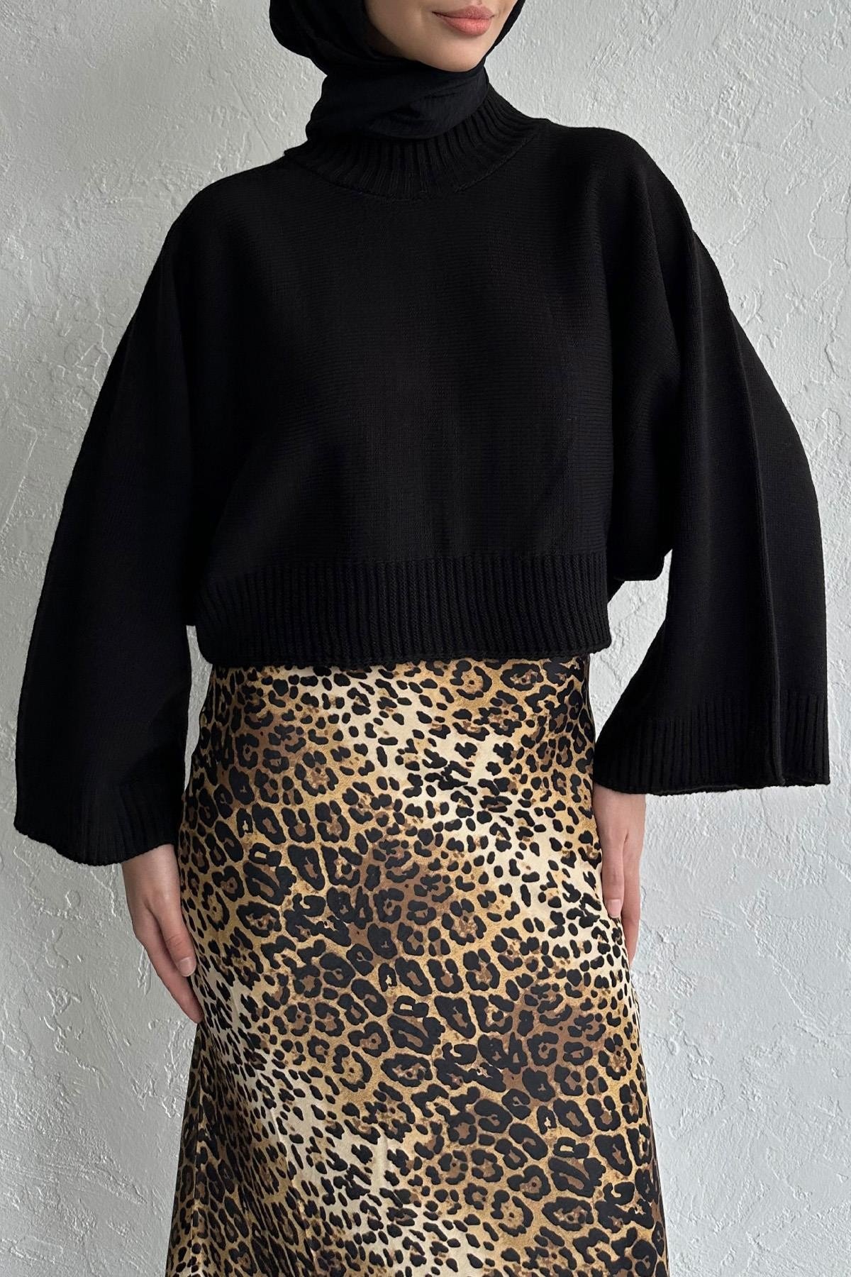 Siyah Triko Kazak, Soğuk esintiler mevsiminin trend parçalarından triko kazaklar ile tarzını yansıt. Görünümünü Leopar Ross Saten Etek ile tamamla.
